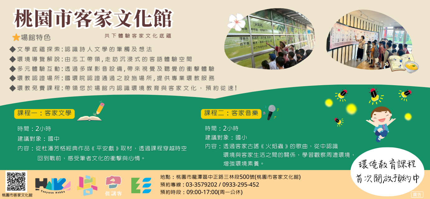 一、 本局所轄桃園市客家文化館兼具客家文化展示與環境教育功能,為環境教育設施場所之一。透過多元展演、親子互動及文化體驗等方式推廣客家文化與環境教育。