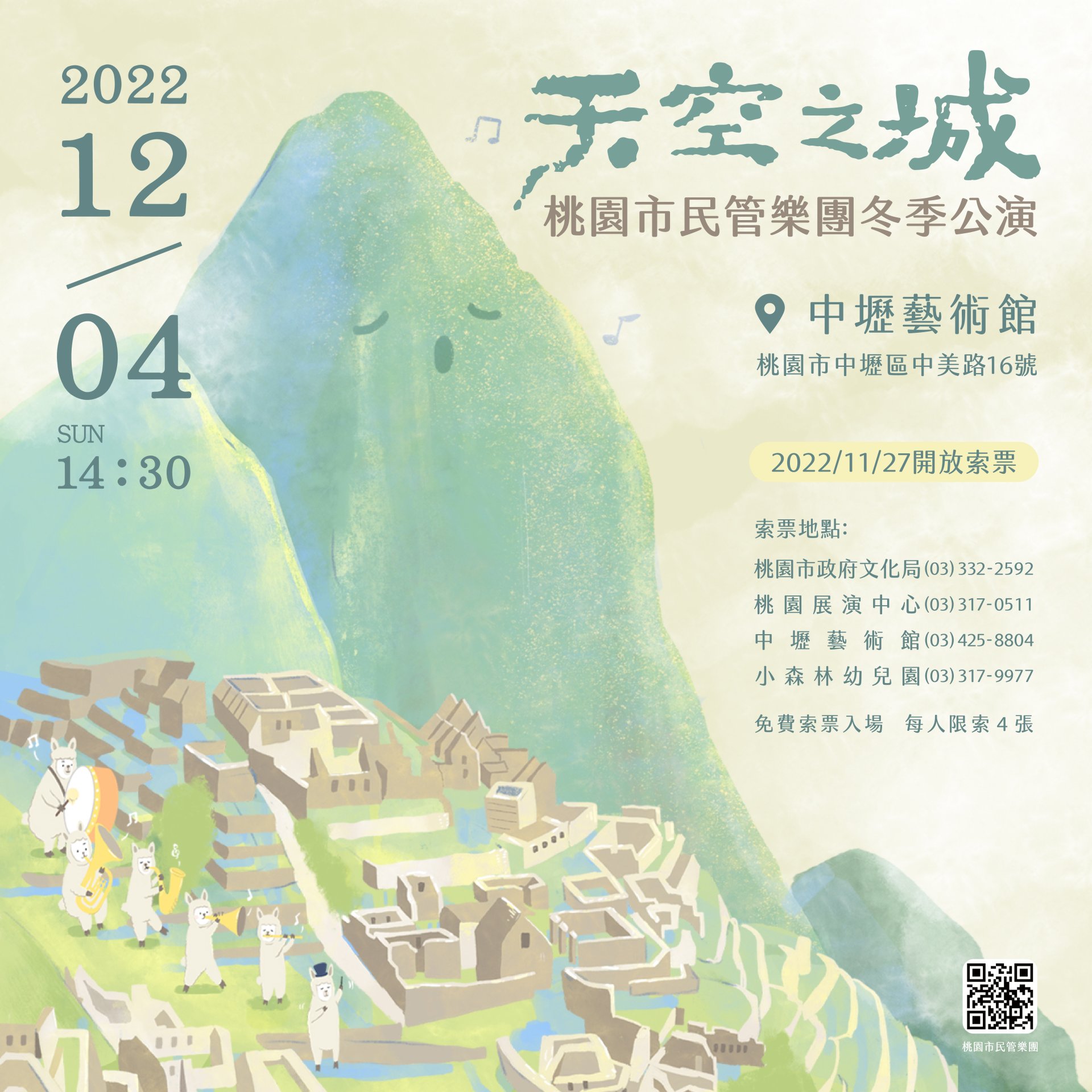 主旨: | 檢送本團承辦活動「2022桃園市民管樂團冬季公演《天空之城》」文宣及線上索票填寫表單,本活動屬推廣性質開放免費索票,敬請惠予協助公告週知並鼓勵民眾踴躍前往聆賞,請 查照。 |