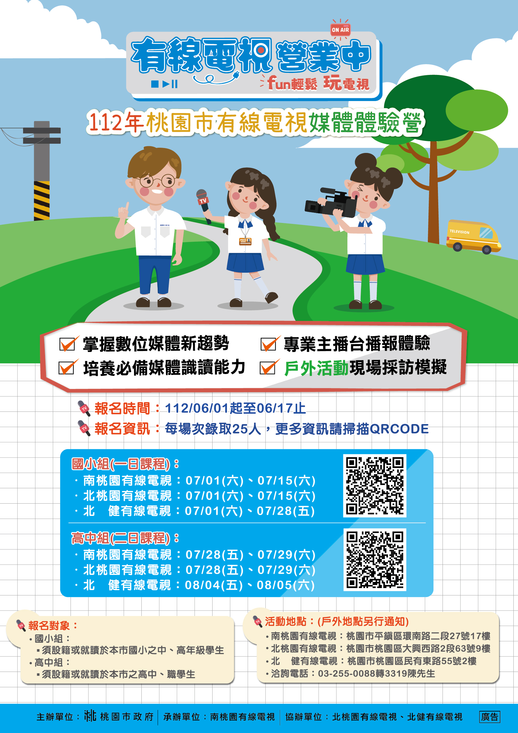 主旨: | 函轉桃園市政府新聞處委託南桃園有線電視股份有限公司(下稱南桃園有線電視)辦理「112年桃園市有線電視媒體體驗營」活動一案,請查照。 |