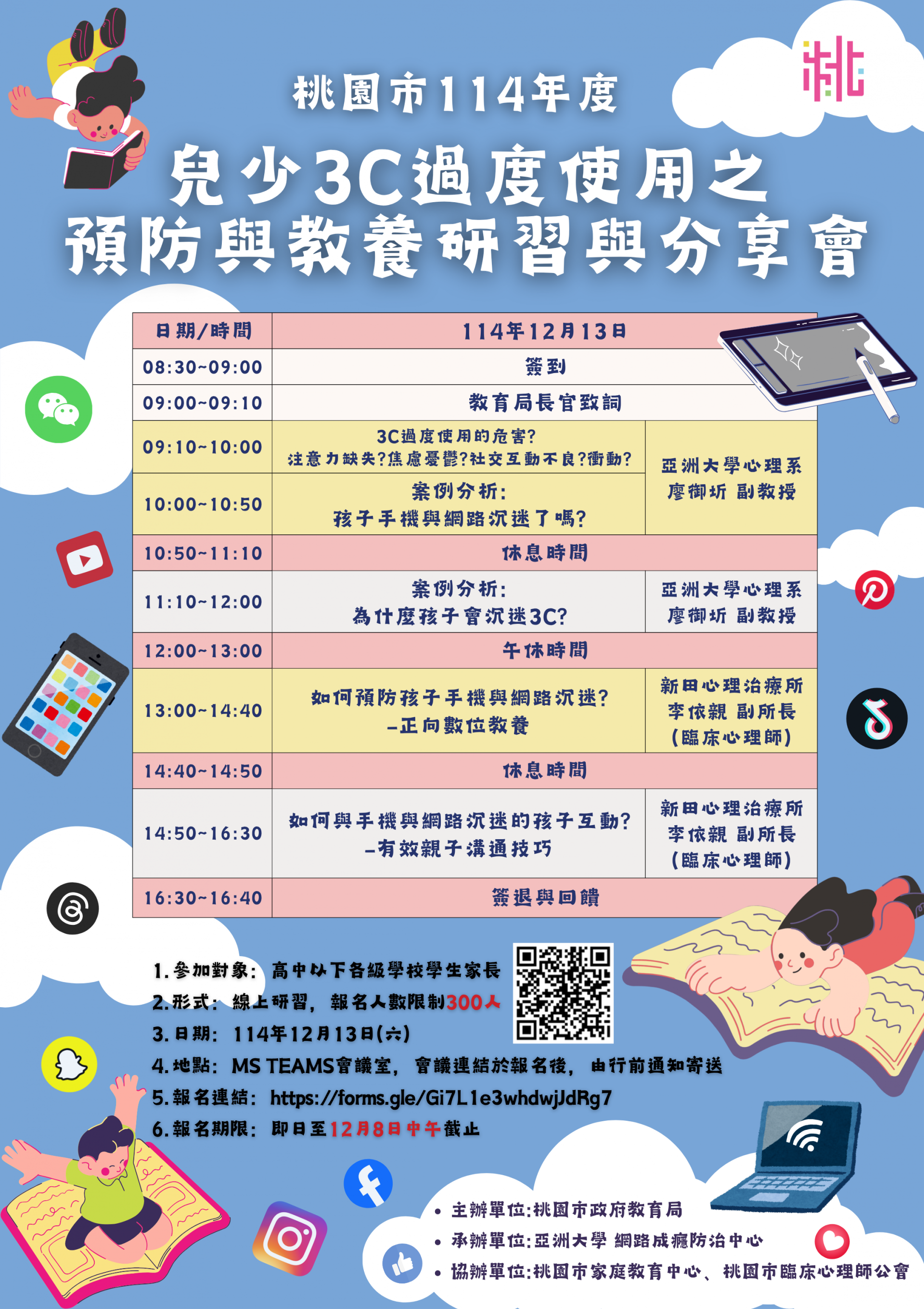 二、 隨著科技融入生活,過度使用3C可能影響孩子的身心發展、專注力、人際互動及作息品質。為協助家長更全面了解3C使用對孩子的影響,並掌握有效的家庭教養策略,114年度本局與亞洲大學合作辦理旨揭分享會,透過案例分析與互動交流,找到更適合自己孩子的教養方式。