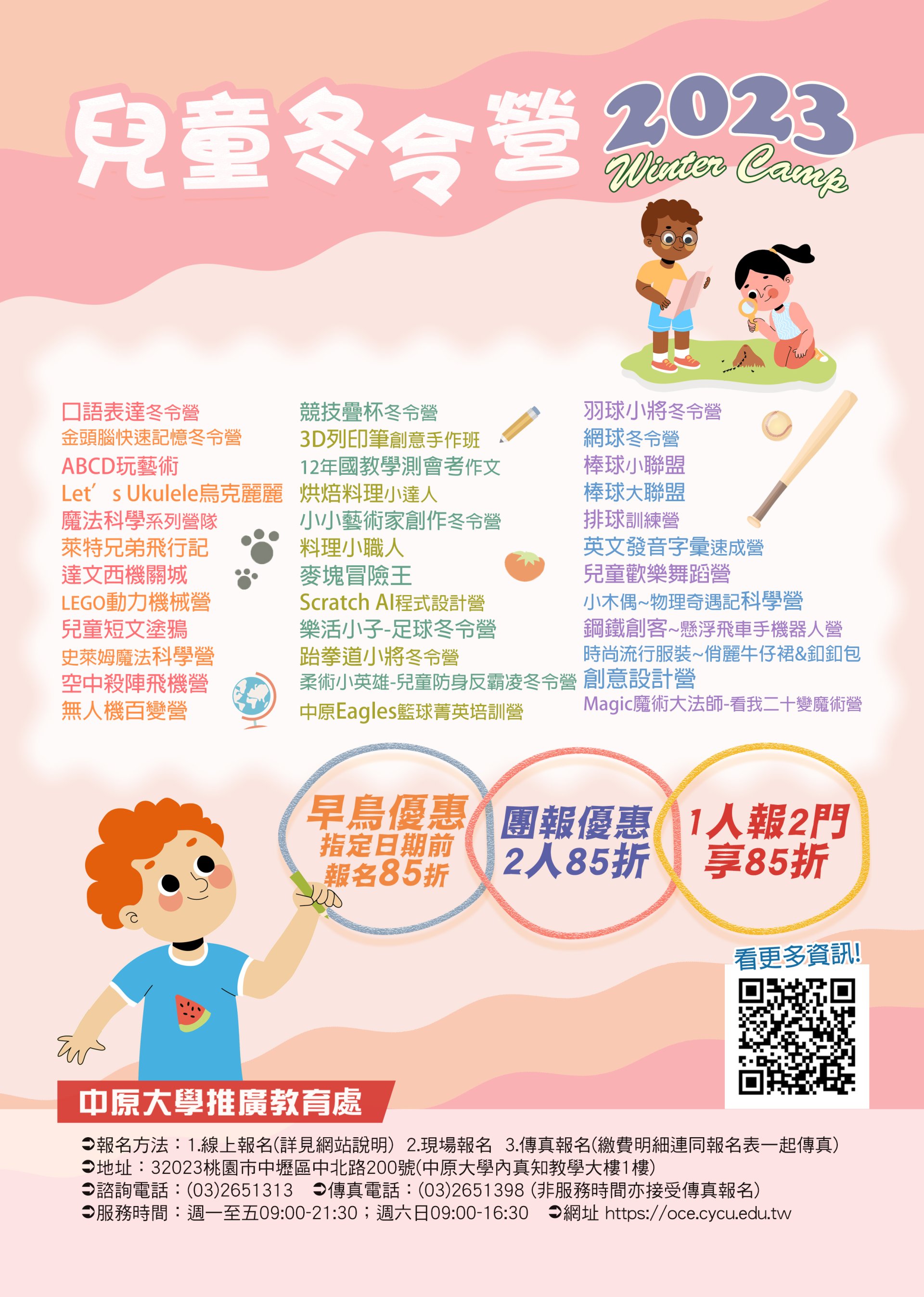 主旨: | 檢送本校推廣教育處開設「兒童冬令營」系列課程海報1份,請查照並惠予公告。 |
