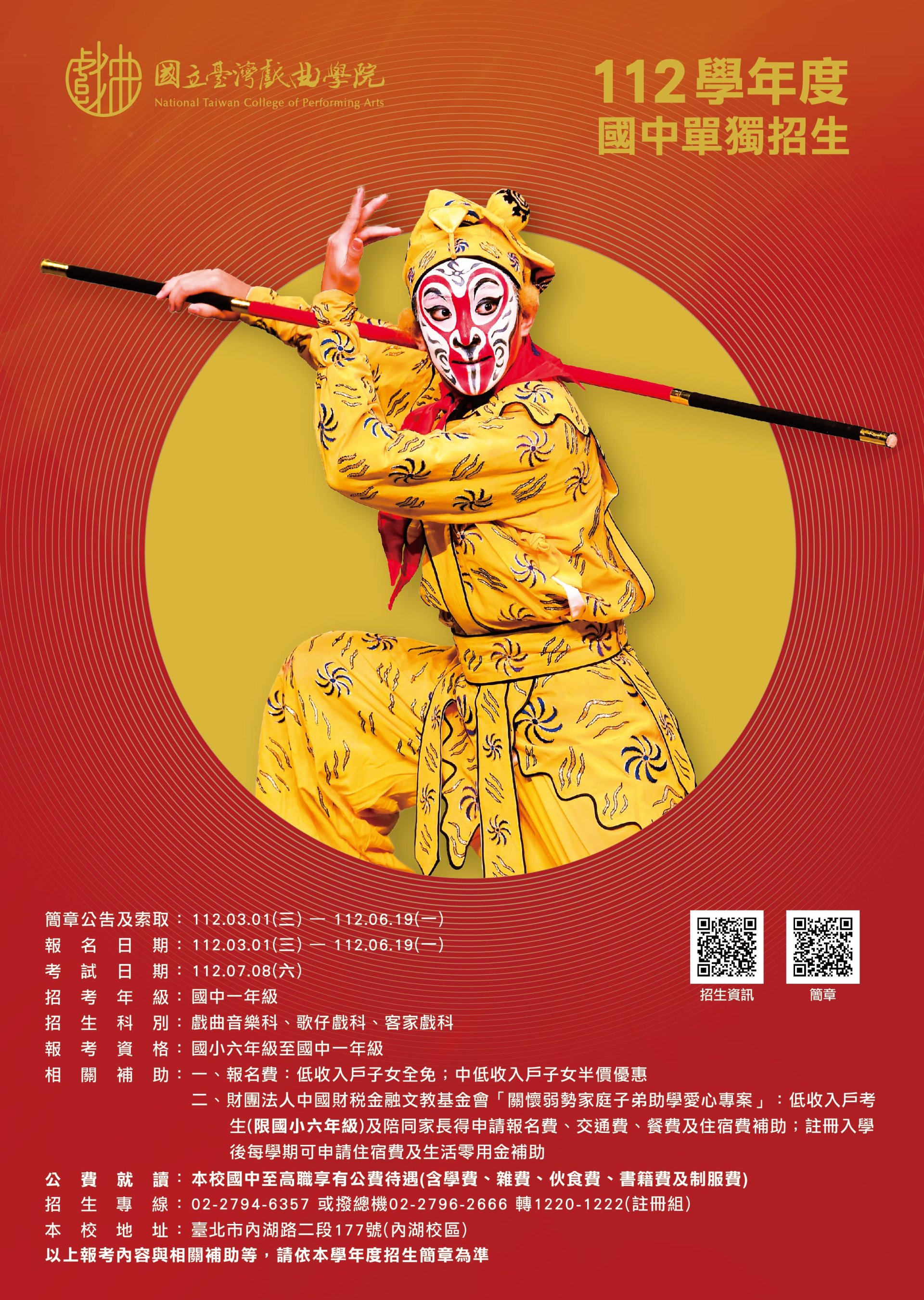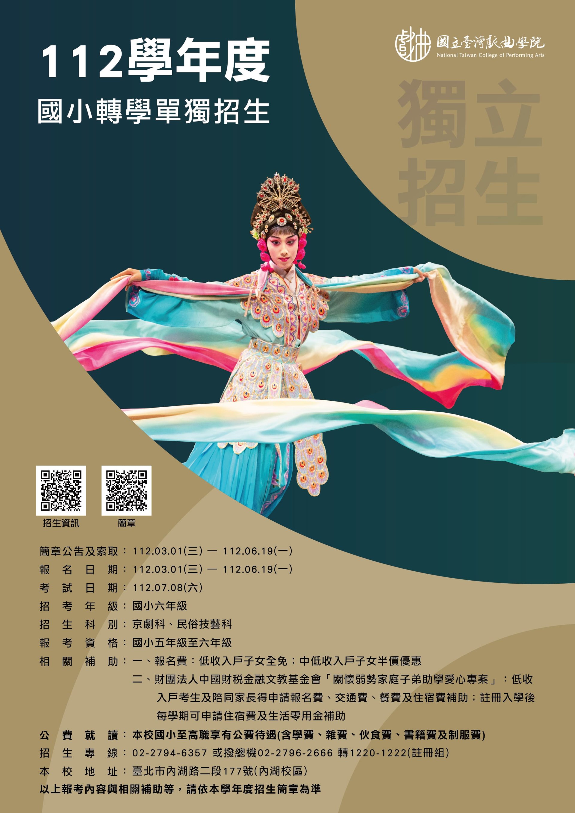 七、 | 其它多元招生資訊請關注「國立臺灣戲曲學院招生資訊」臉書粉絲專頁(https://www.facebook.com/NTCPA.Information),亦可參考該校宣傳影片《劇校生的一天》(https://youtu.be/_yd-OI_l4BU),招生專線:(02)2794-6357。 |