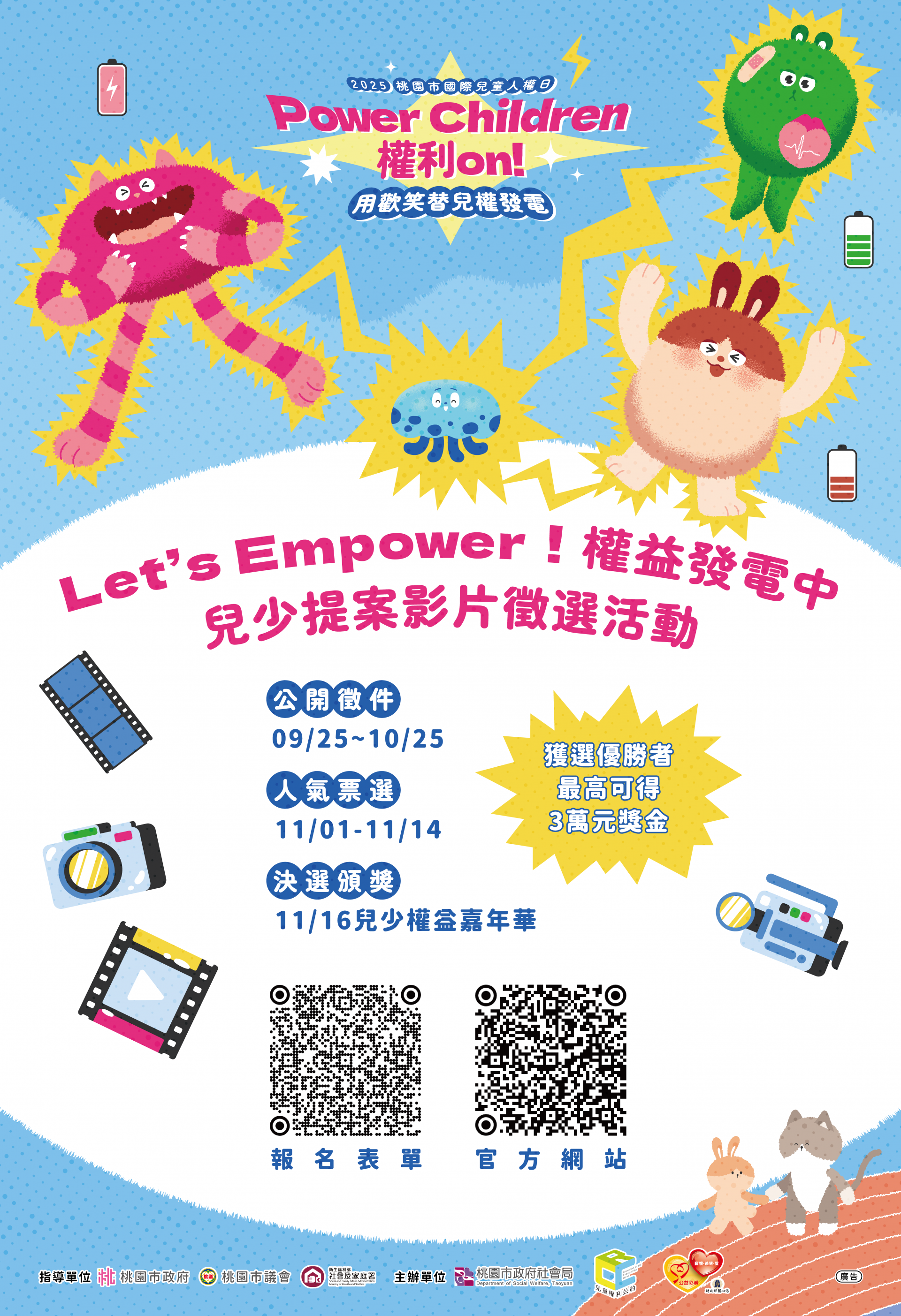 | 二、 | 為落實兒少表意及參與公共政策的權利,邀請設籍或實際居住桃園市或就讀桃園市學校11歲(含)以上至18歲以下兒少,針對兒童權利公約政策、法規運行或各類行政事務運作等事項,以拍攝影片的形式,提出檢討及策進,並邀請大眾關注此項議題。 |