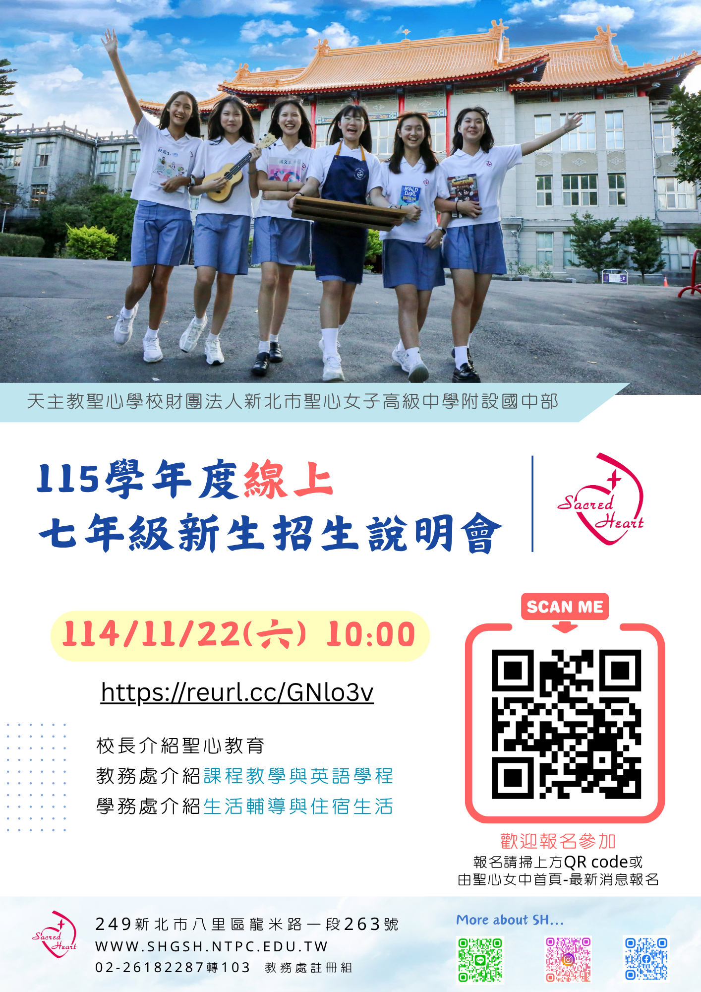 (二) 聖心女中首頁http://www.shgsh.ntpc.edu.tw—最新消息--115學年度七年級新生線上招生說明會
