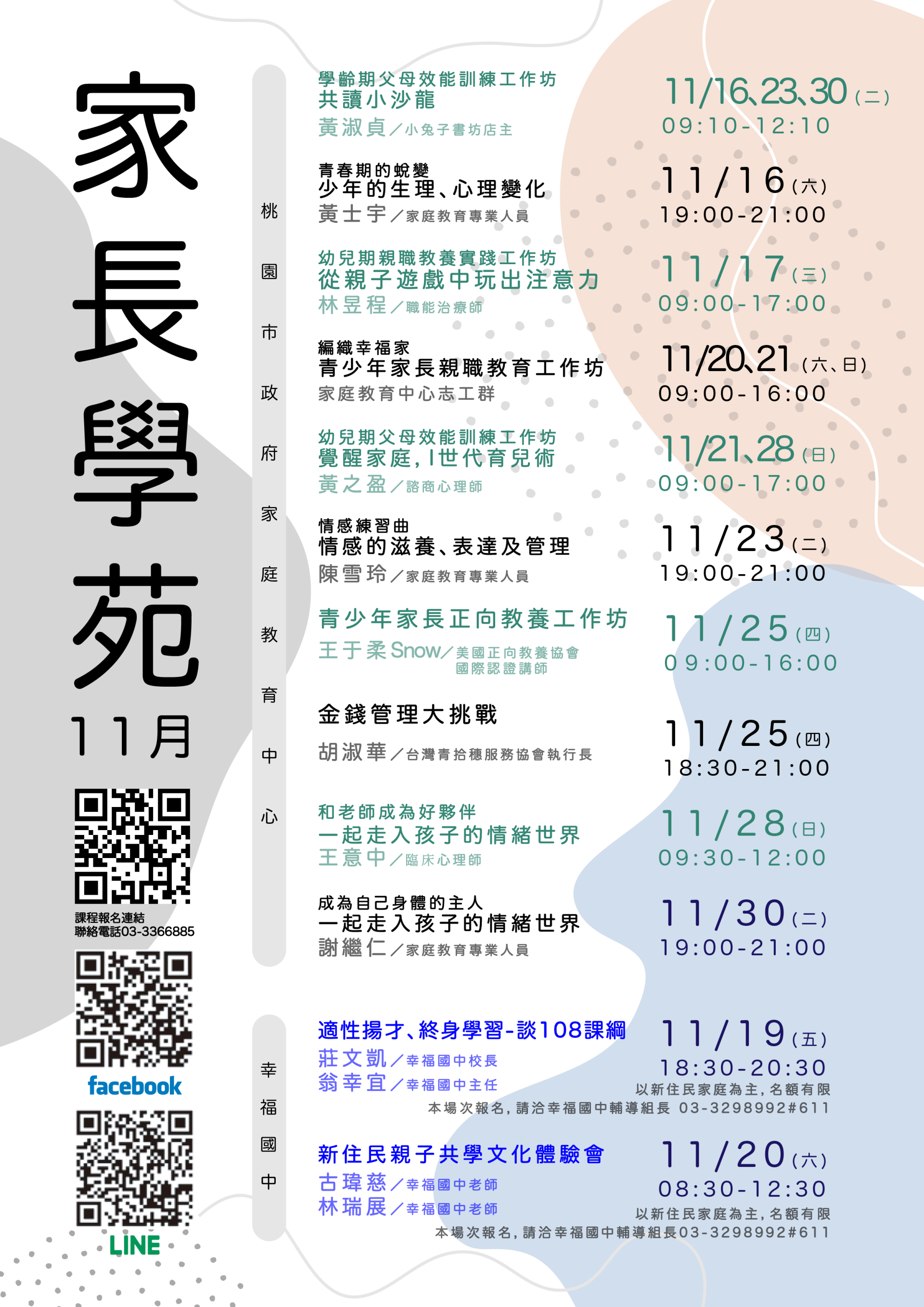 說明: 為提升家長親職教育知能,本中心辦理家長學苑,免費提供家長親職教育相關課程,惠請貴校協助公告宣傳,鼓勵有需求之家長(如中輟學生、偏差行為學生家長等)及對主題有興趣之家長踴躍參加。
