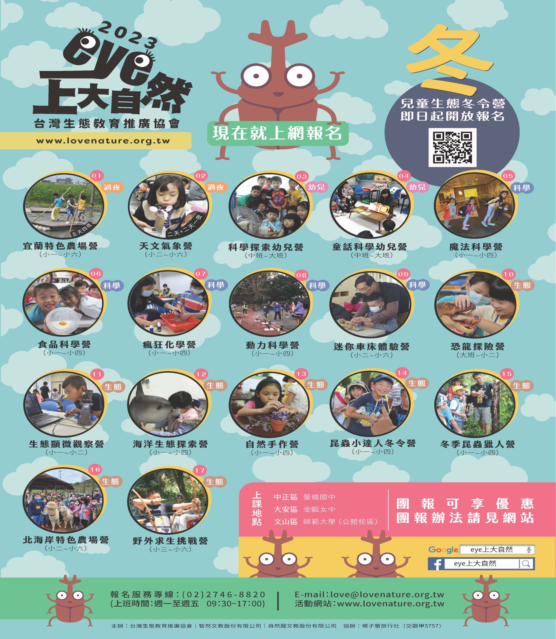 | 主旨: | 台灣生態教育推廣協會將舉辦「eye上大自然~2023寒假兒童生態冬令營」活動,歡迎參加 |