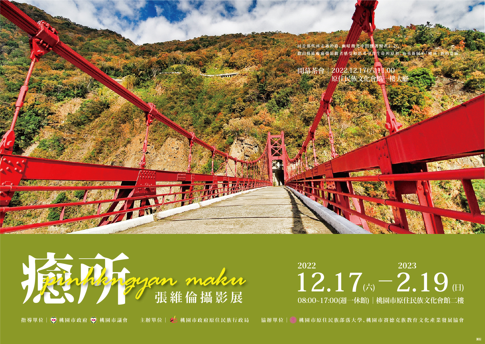 | 1、 | 展覽地點:桃園市原住民族文化會館(桃園市大溪區員林路一段29巷101號)。 |