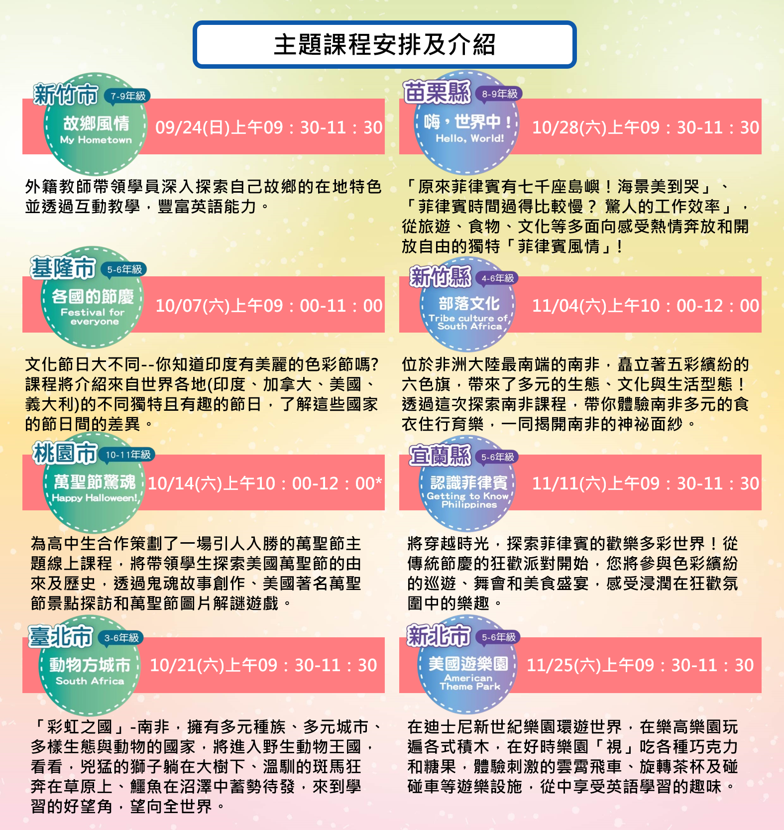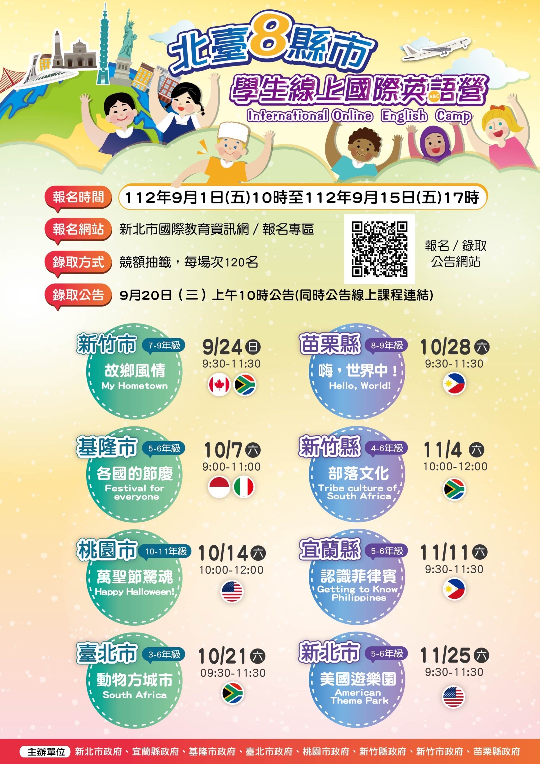 | 二、 | 計畫宗旨:為培育北臺8縣市學生具備英語溝通能力及國際移動力,透過各縣市締結姊妹校及外籍師資等資源,運用數位科技進行線上英語交流,介紹各國當地風土民情,增進學生文化理解。 |
