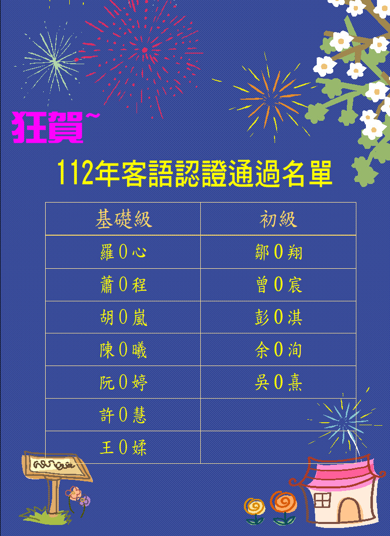 本校學生通過112年度客語認證全國基礎級暨初級認證