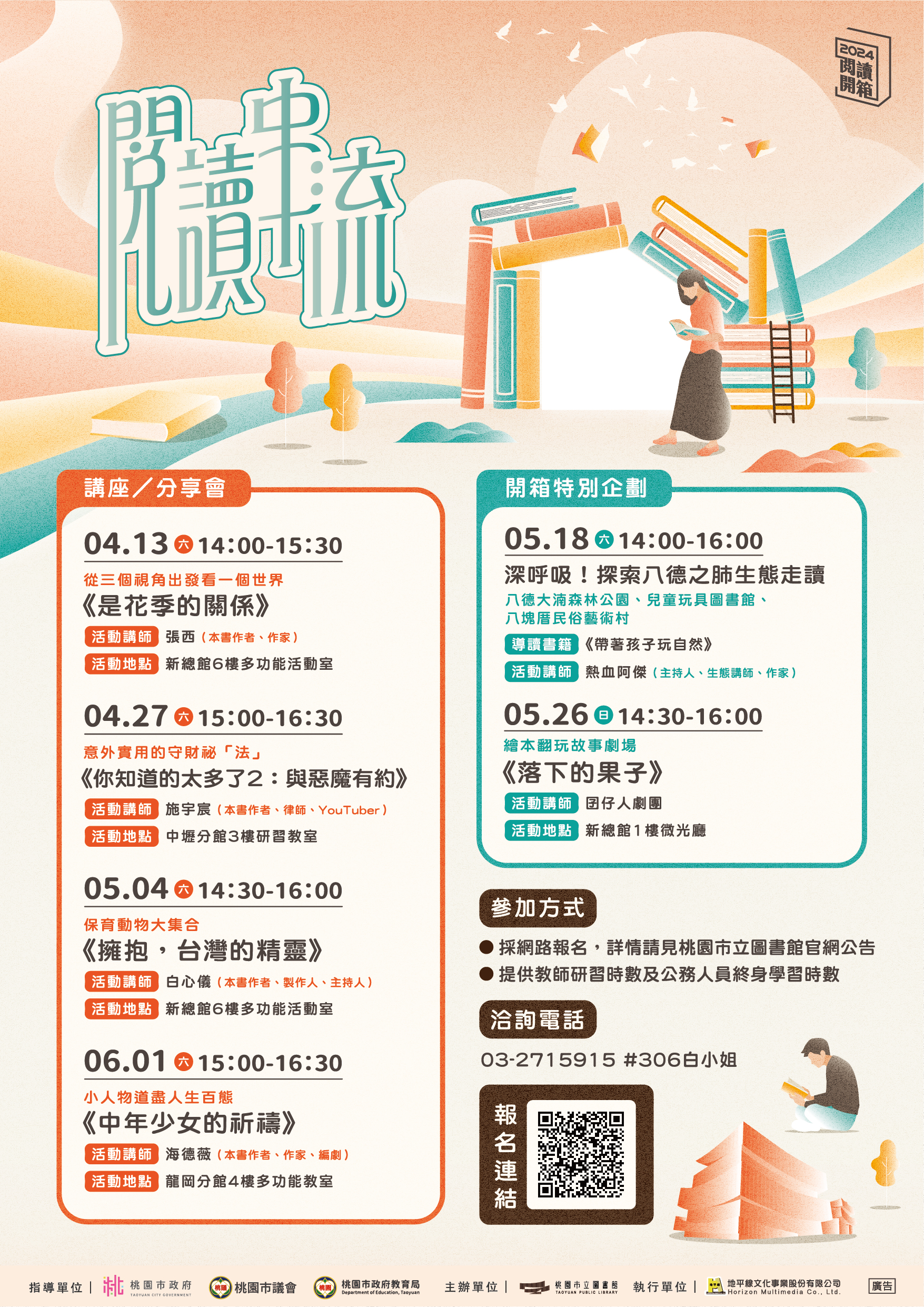 | 二、 | 「2024桃園閱讀開箱:閱讀串流」第一季系列活動於113年 4月13日至6月1日辦理,場次如下: |
