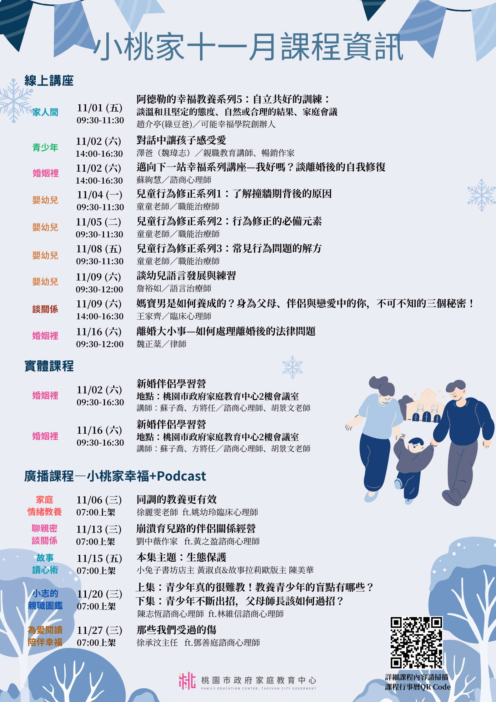 或追蹤「桃園市政府家庭教育中心」FB粉絲專頁;另倘有家庭教育個別化服務需求,可撥打4128185諮詢專線或申請小桃家線上諮詢室(https://reurl.cc/oZWOY5)服務。