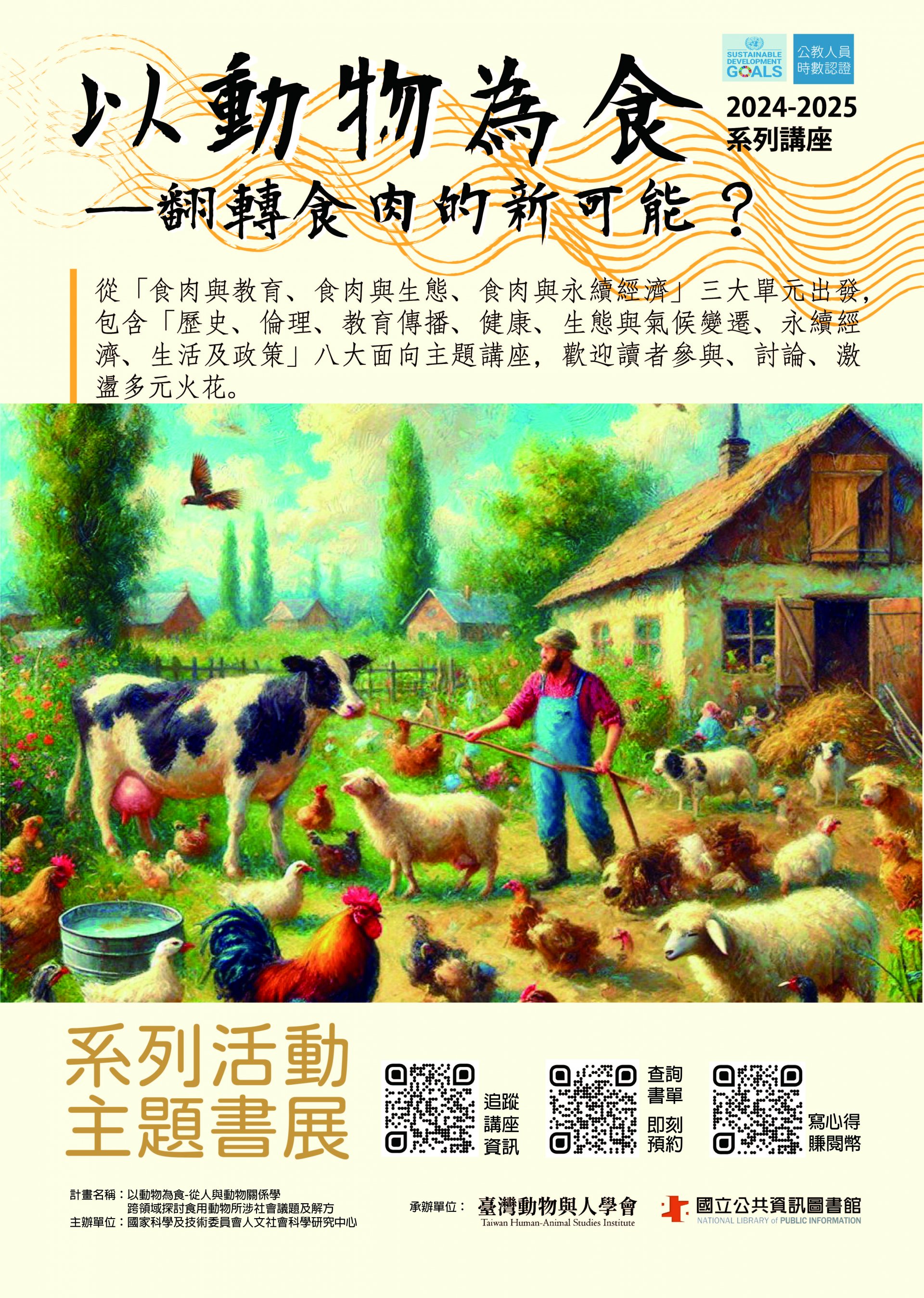 二、 旨揭活動由國立公共資訊圖書館館與「臺灣動物與人學會」合辦,自113年8月起至114年6月止,就「以動物為食」主題邀請相關領域專家與教育者,與讀者共同參與、討論、激盪多元火花,為自己、家人及大眾未來可能遭遇的生活問題預想因應;系列講座主題包括SDGs、食農、科普等相關內容,採實體講座及線上同步直播方式進行,並搭配線上及實體書展,每場介紹相關書籍。