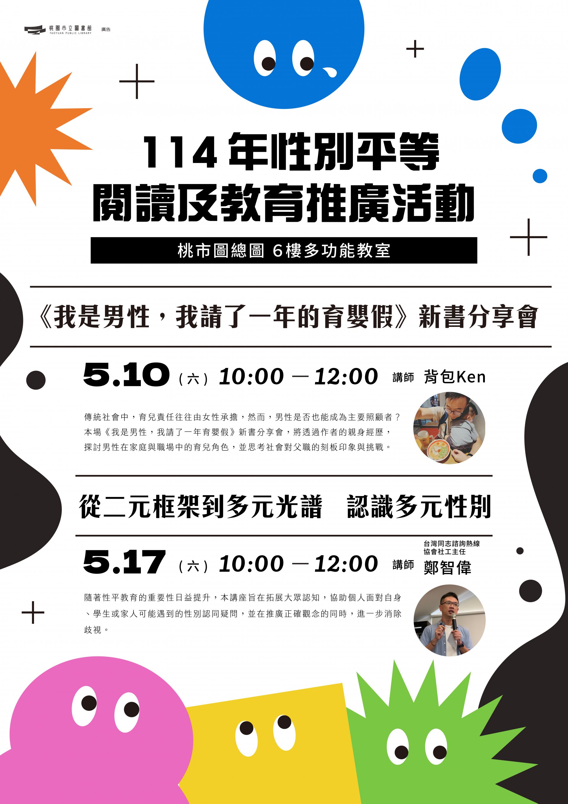 | (一) | 114年5月10日(星期六)上午10時至12時辦理《我是男性,我請了一年育嬰假》新書分享會,將邀請本書作者-背包Ken,分享自身請育嬰假親身經歷,探討男性在家庭與職場中的育兒角色; |