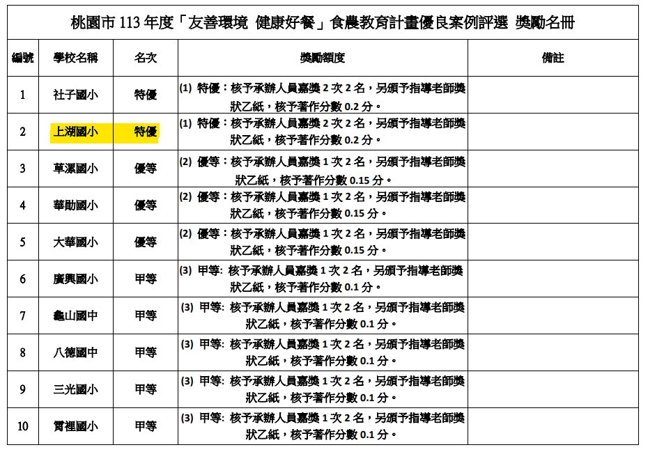 恭賀!本校教師團隊參加桃園市113年度「友善環境 健康好餐」食農教育計畫優良案例評選,榮獲特優